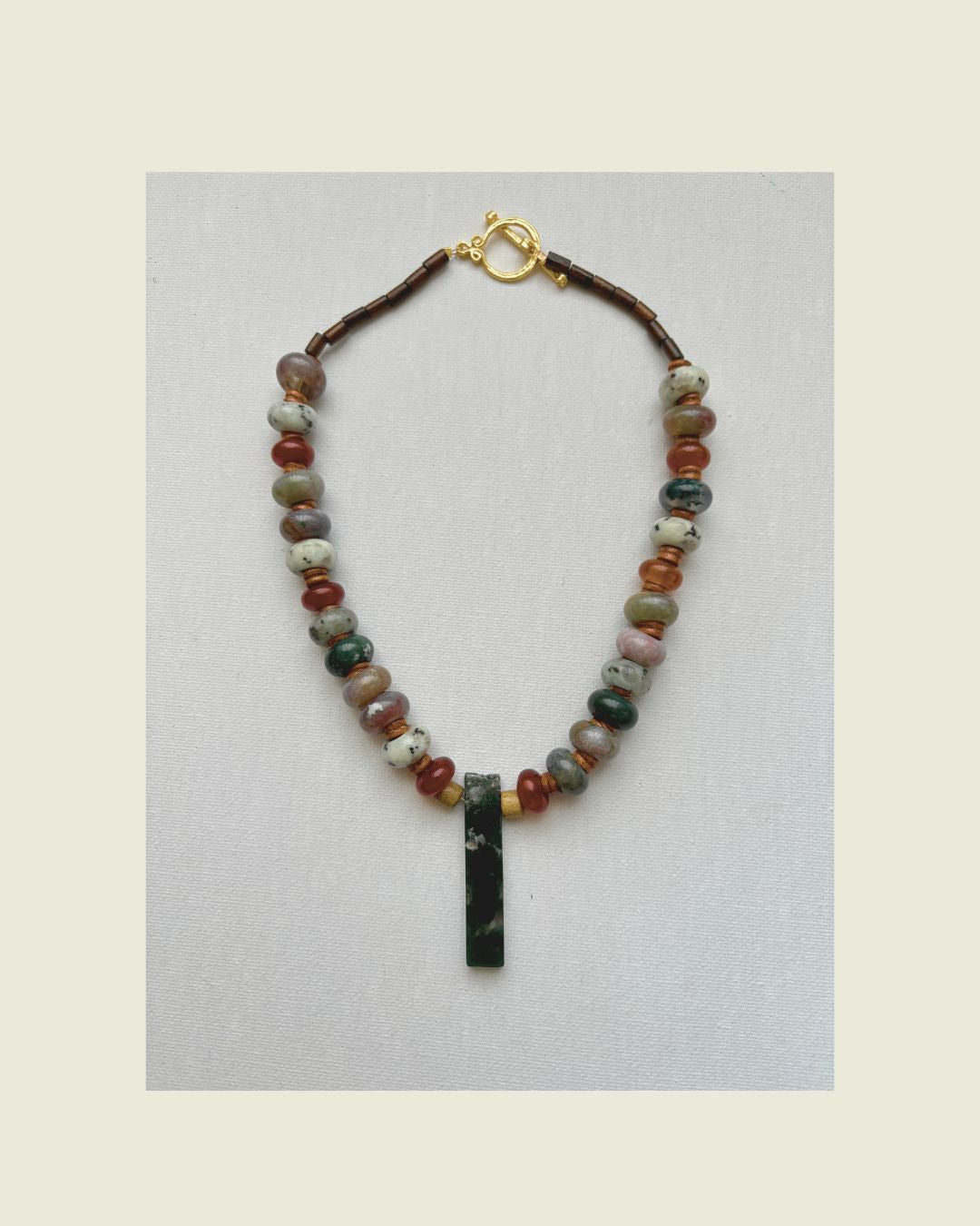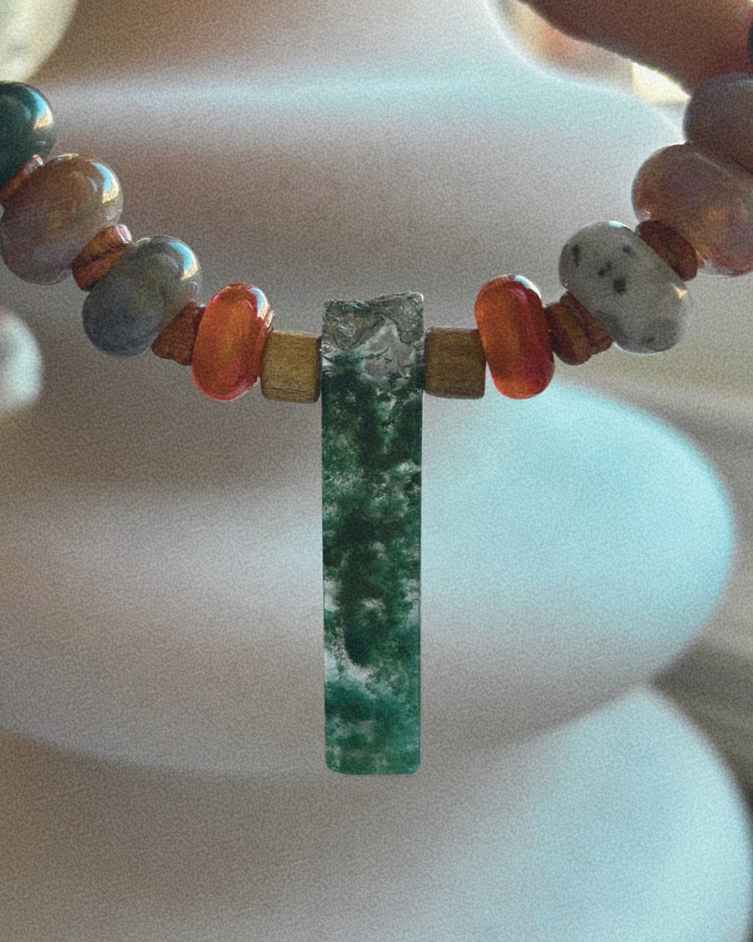 made with Indian agate beads, wood beads and a central moss agate pendant.